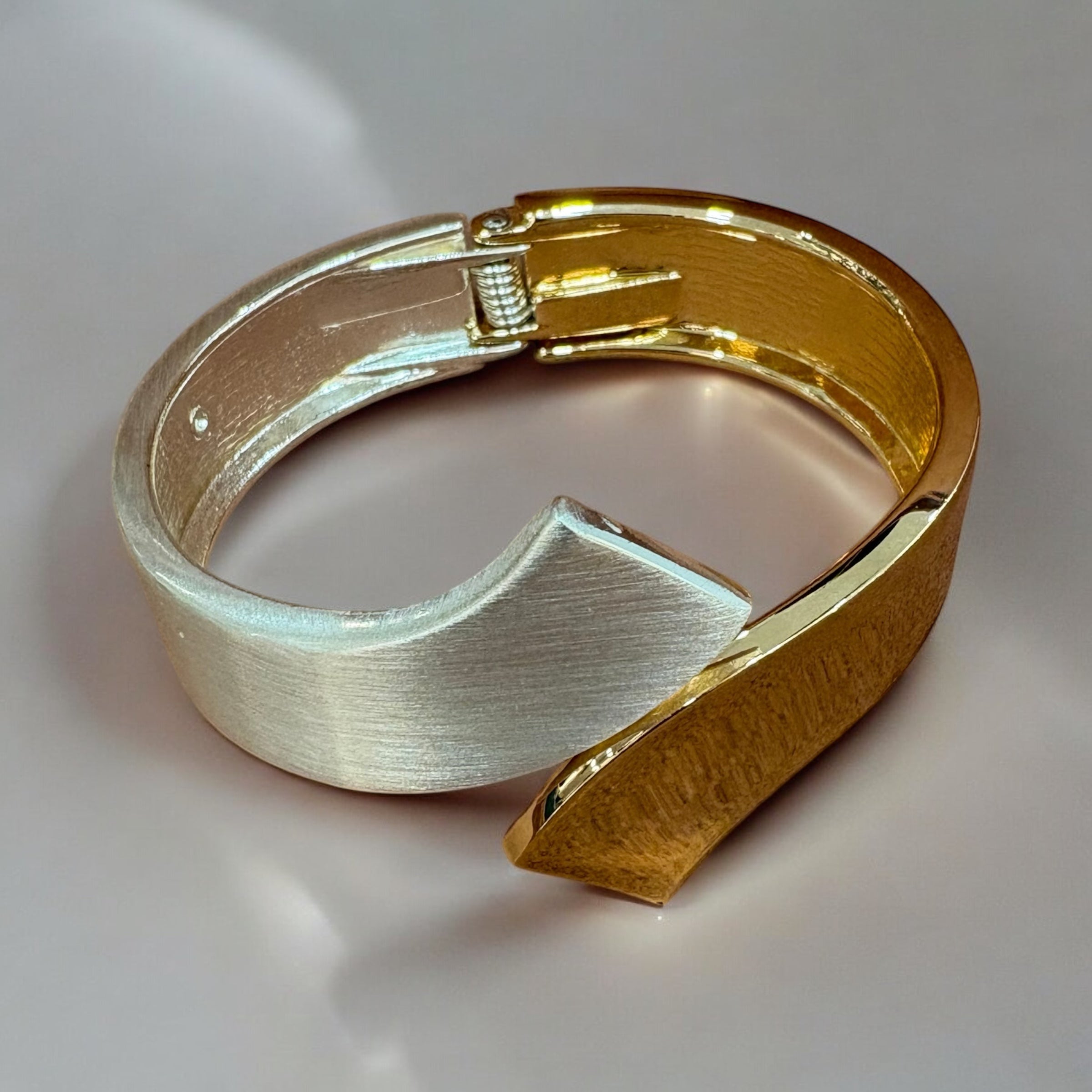 Make a bold statement with this stunning two-tone cuff bracelet, designed to elevate any outfit with its modern elegance. Featuring a sleek combination of brushed silver and polished gold finishes, this bracelet seamlessly blends contemporary style with timeless sophistication.