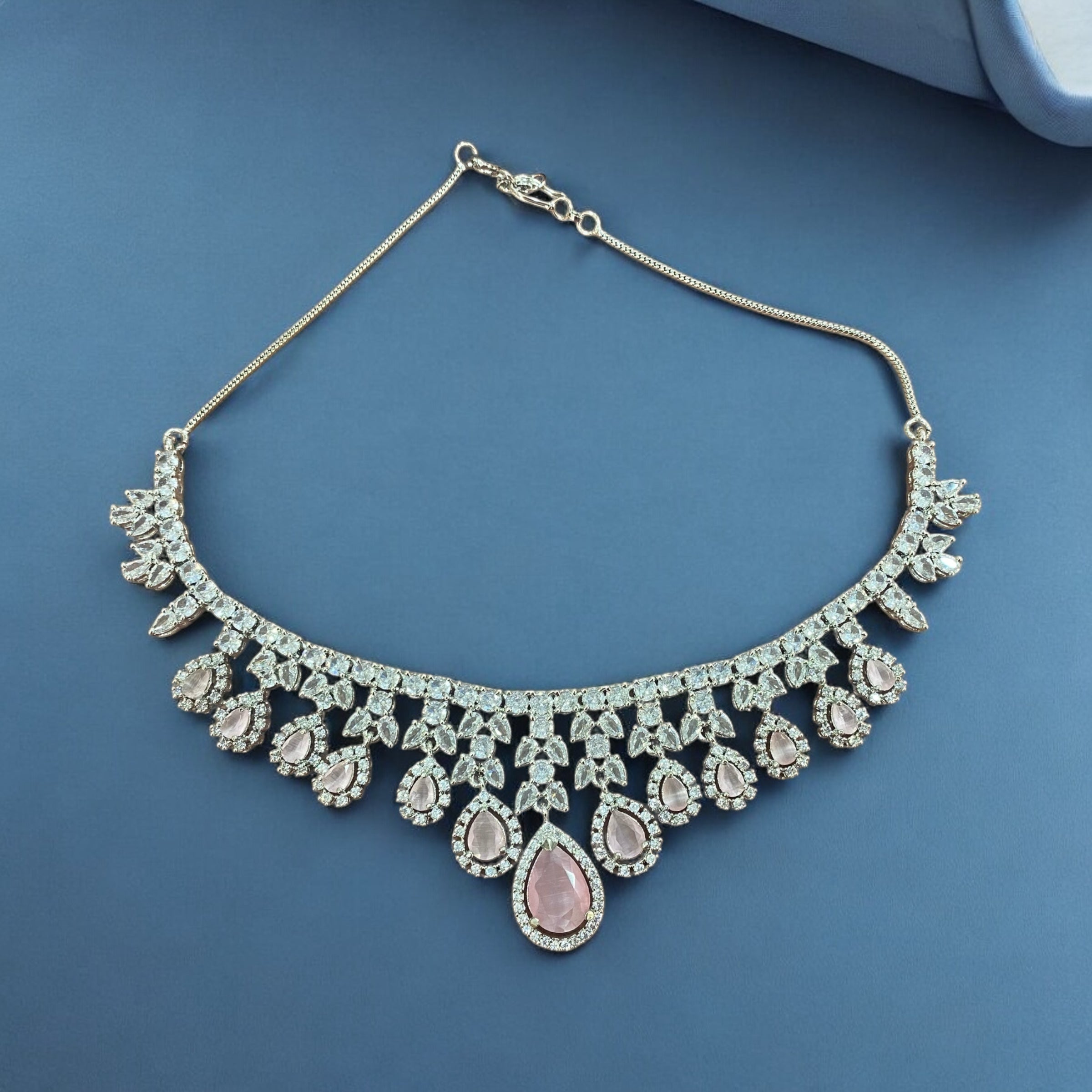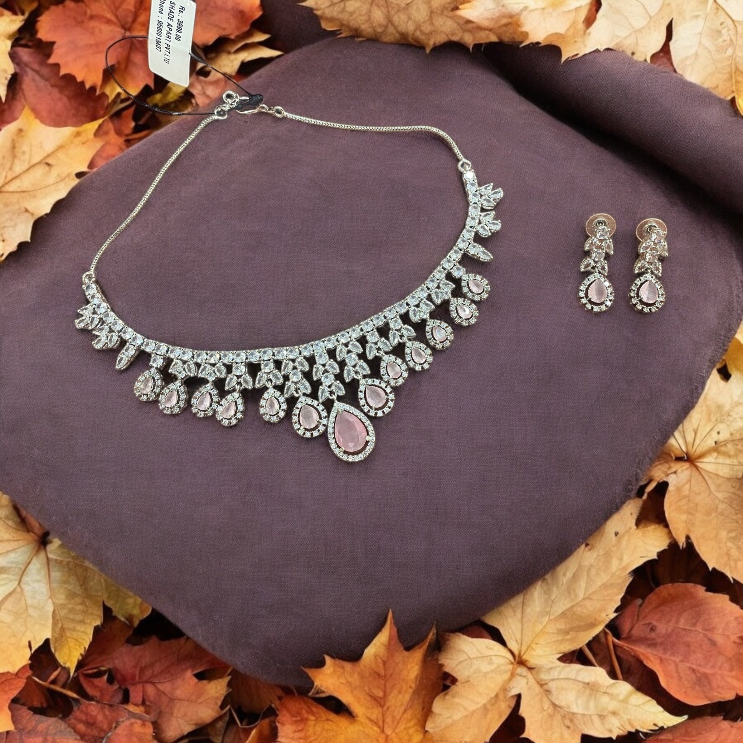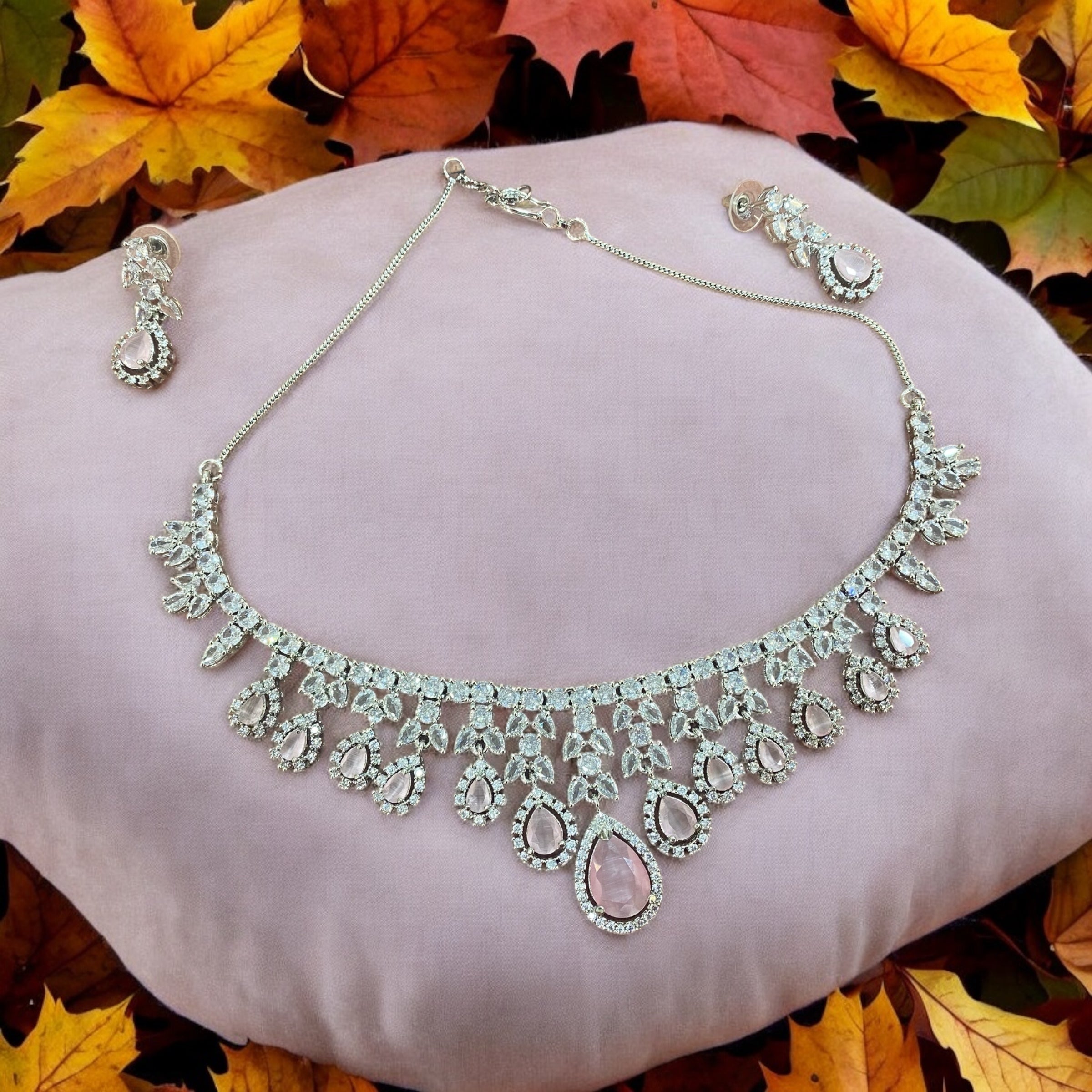 Add a touch of glamour to your special occasions with this exquisite necklace and earring set. Featuring shimmering clear stones meticulously arranged in a cascading design, this set is adorned with delicate pink teardrop-shaped stones that enhance its elegance and sophistication.