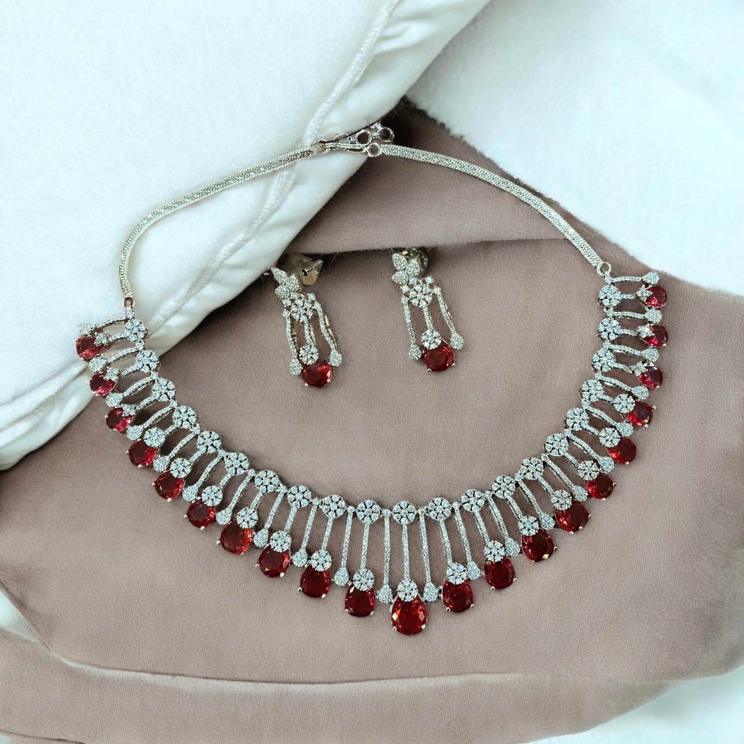 • Design: The necklace features a stunning row of vibrant ruby-red stones gracefully interlinked with sparkling cubic zirconia, creating a captivating fan-like design. The matching drop earrings beautifully complement the necklace, completing the elegant look.