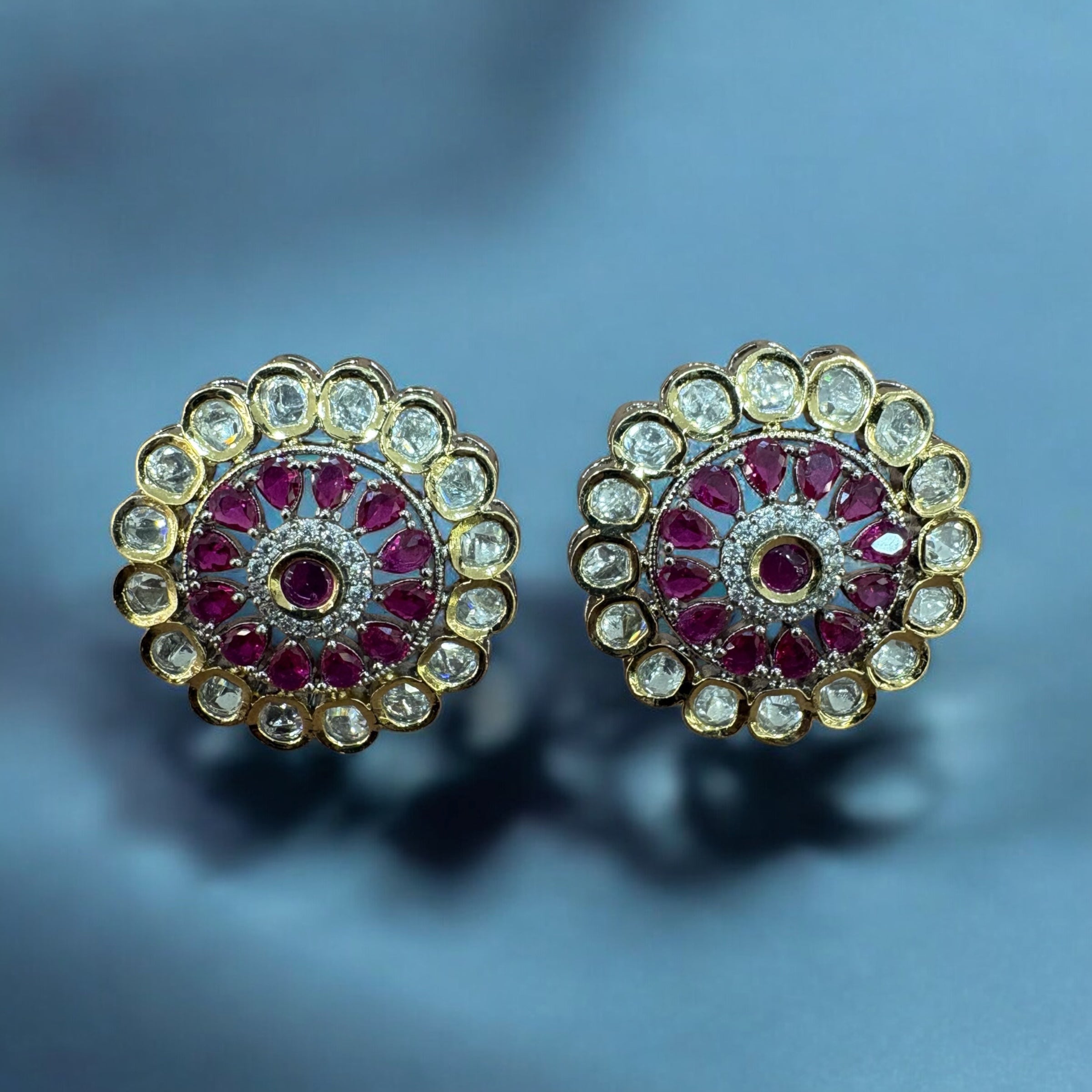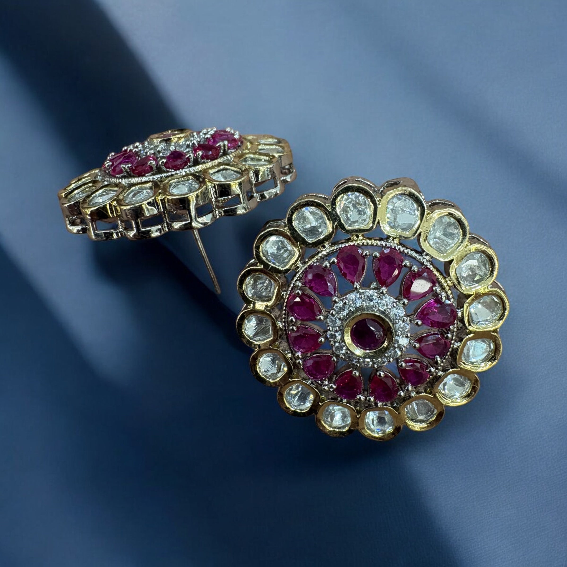 Enhance your jewelry collection with these exquisite statement earrings, meticulously crafted to exude elegance and sophistication. Featuring a stunning circular design, these earrings are adorned with radiant ruby gemstones in a mesmerizing floral pattern at the center, surrounded by dazzling uncut diamonds (polki) set in a rich gold-plated finish. The intricate detailing and vibrant contrast of deep red rubies with the sparkling white stones make these earrings a timeless accessory for special occasions.