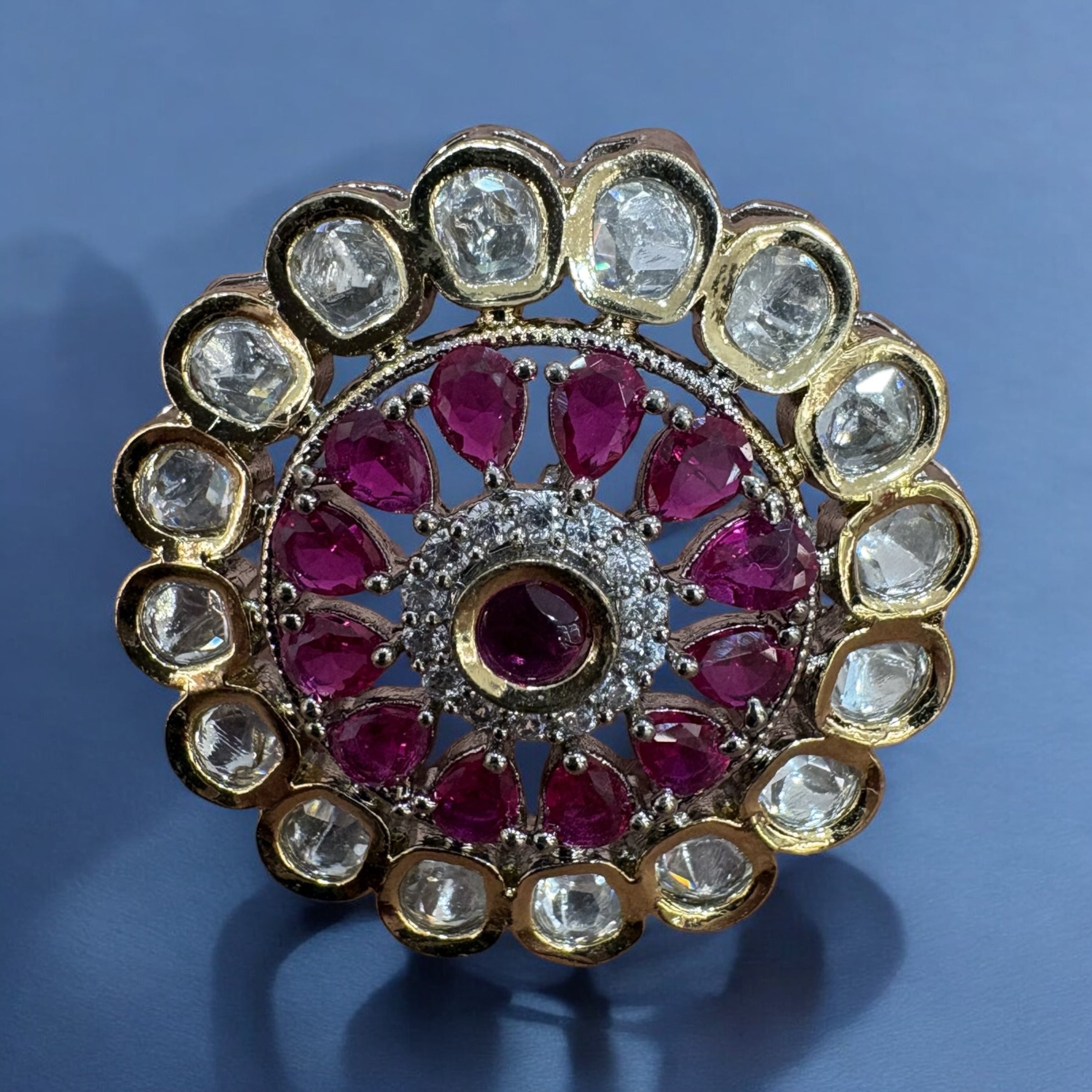 • Material: Gold-plated metal with uncut diamonds (polki) and ruby gemstones