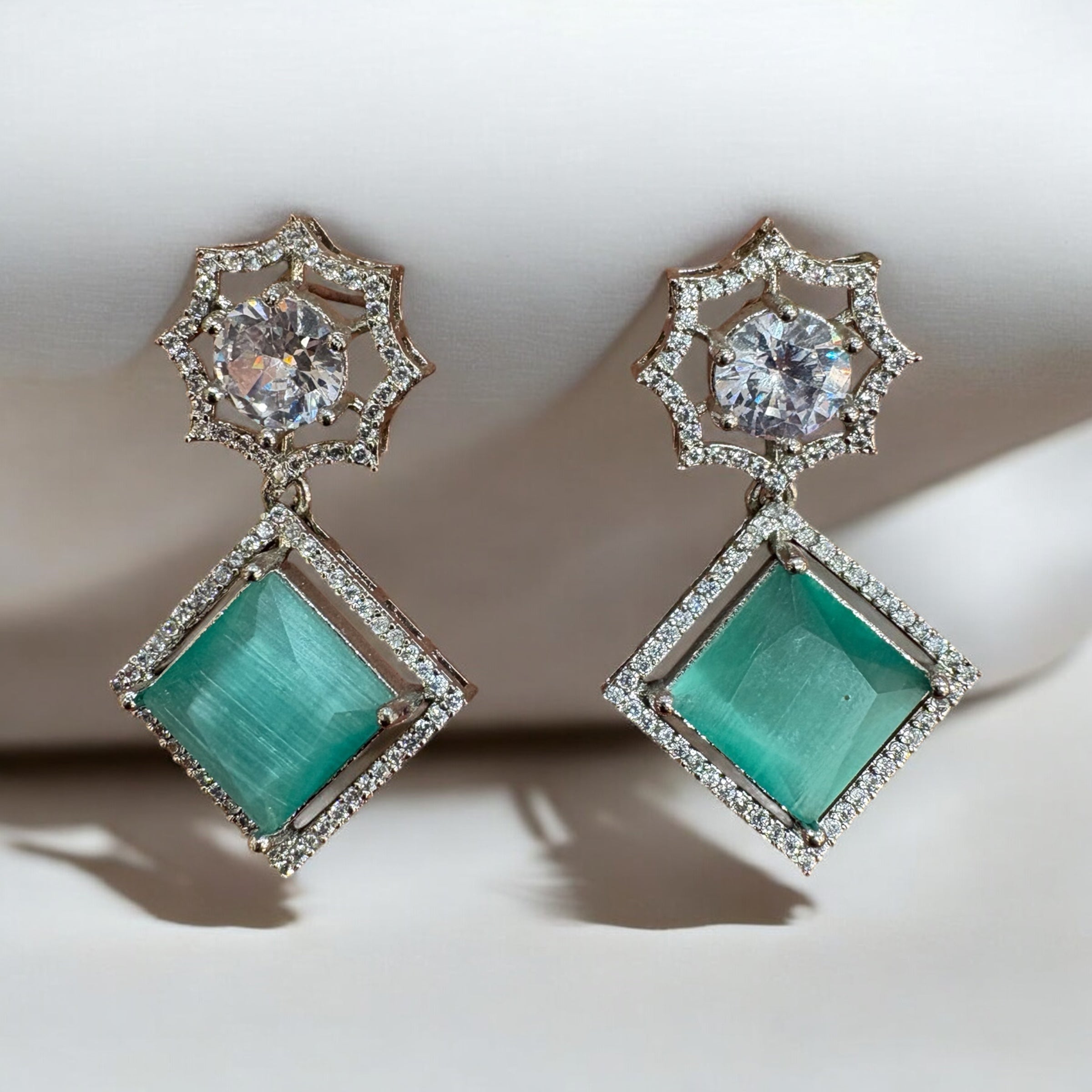 The top section of the earrings showcases a brilliant round-cut diamond, framed with a delicate starburst-inspired design for added elegance. This geometric combination of shapes and the contrasting green and white stones make these earrings a versatile choice for any occasion.