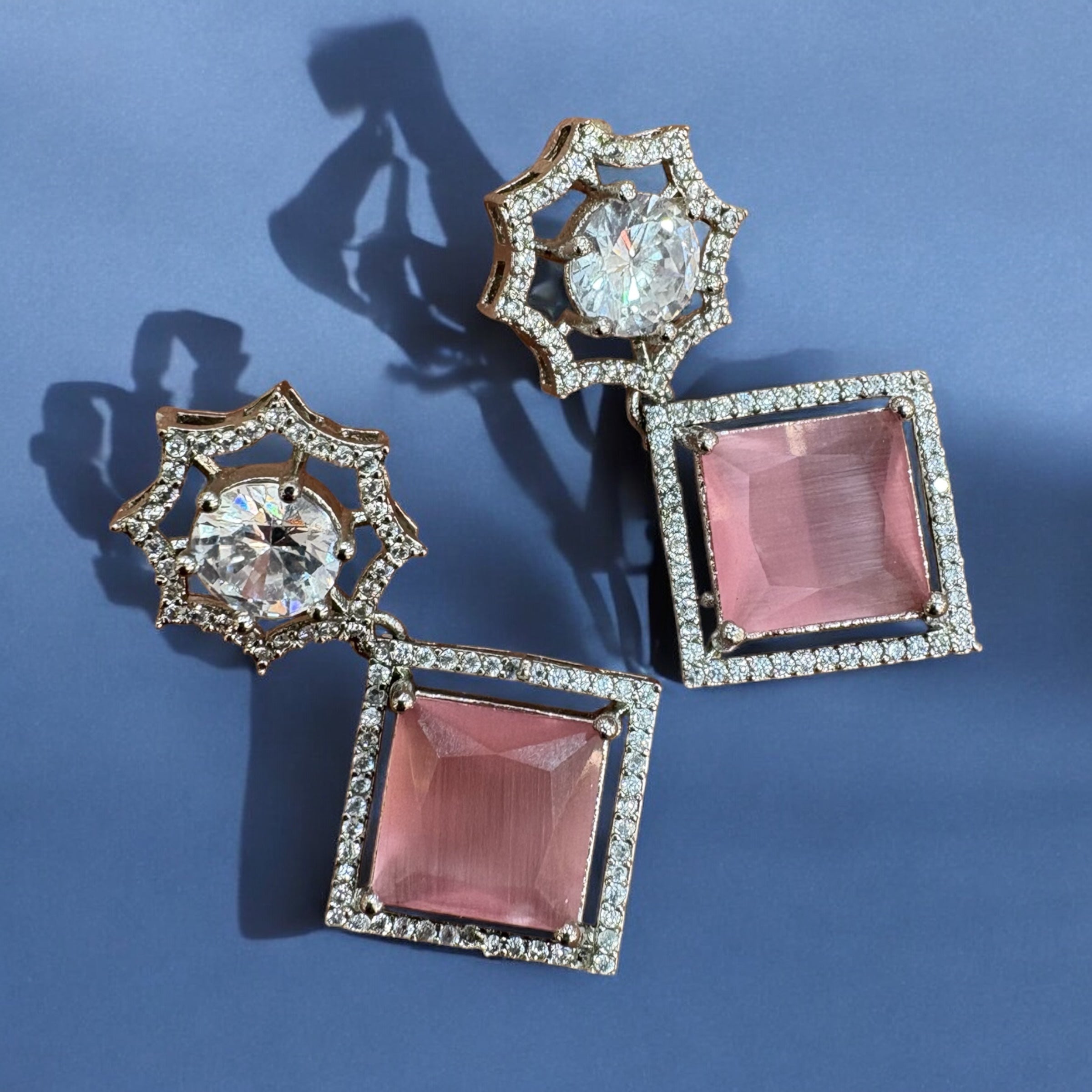 These sophisticated earrings effortlessly blend modern design with timeless charm. Featuring a striking green cat-eye gemstone encased in a diamond-encrusted square frame, these earrings are perfect for making a subtle yet bold statement.