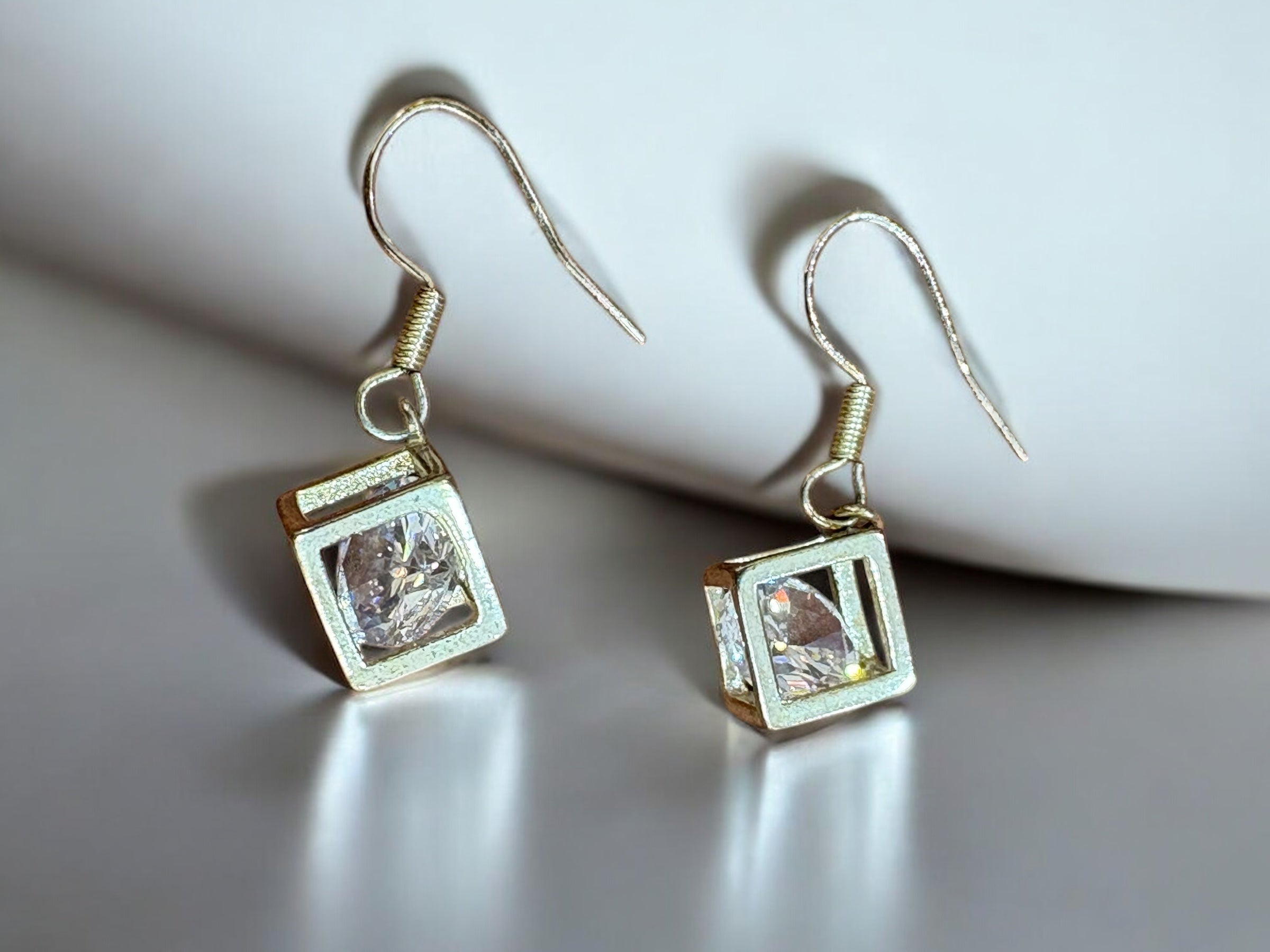 Add a modern and elegant touch to your jewelry collection with these Geometric Cube Dangle Earrings. Featuring a gold-tone open cube design, each earring holds a stunning, high-quality American Diamond (AD) stone, which sparkles beautifully from every angle. The lightweight yet durable structure ensures comfort for all-day wear, making them perfect for both casual and special occasions.