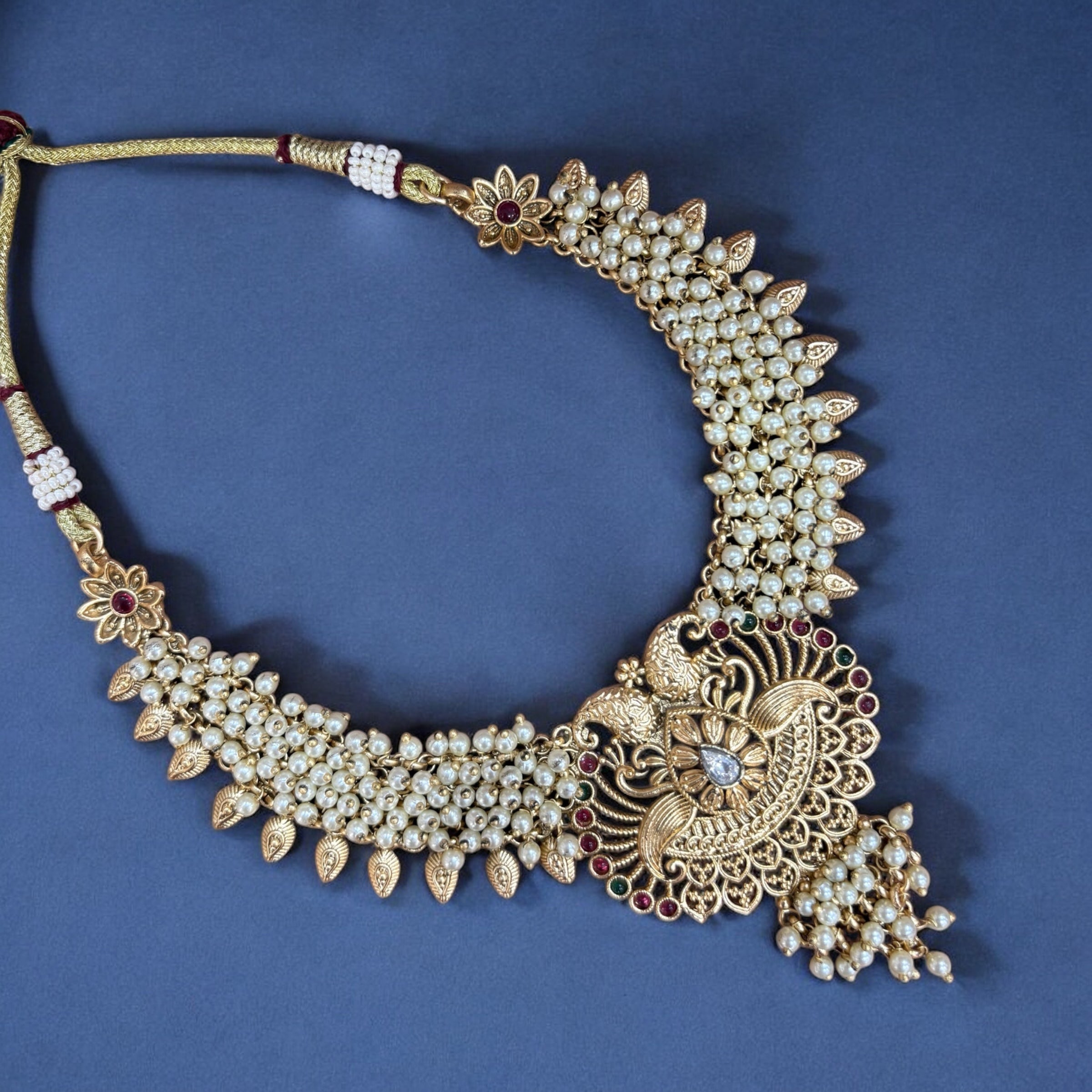 Elevate your jewelry collection with this stunning gold and pearl necklace set, beautifully crafted to bring timeless elegance to any occasion. This luxurious set features intricate detailing, blending classic gold craftsmanship with lustrous pearls and delicate embellishments.