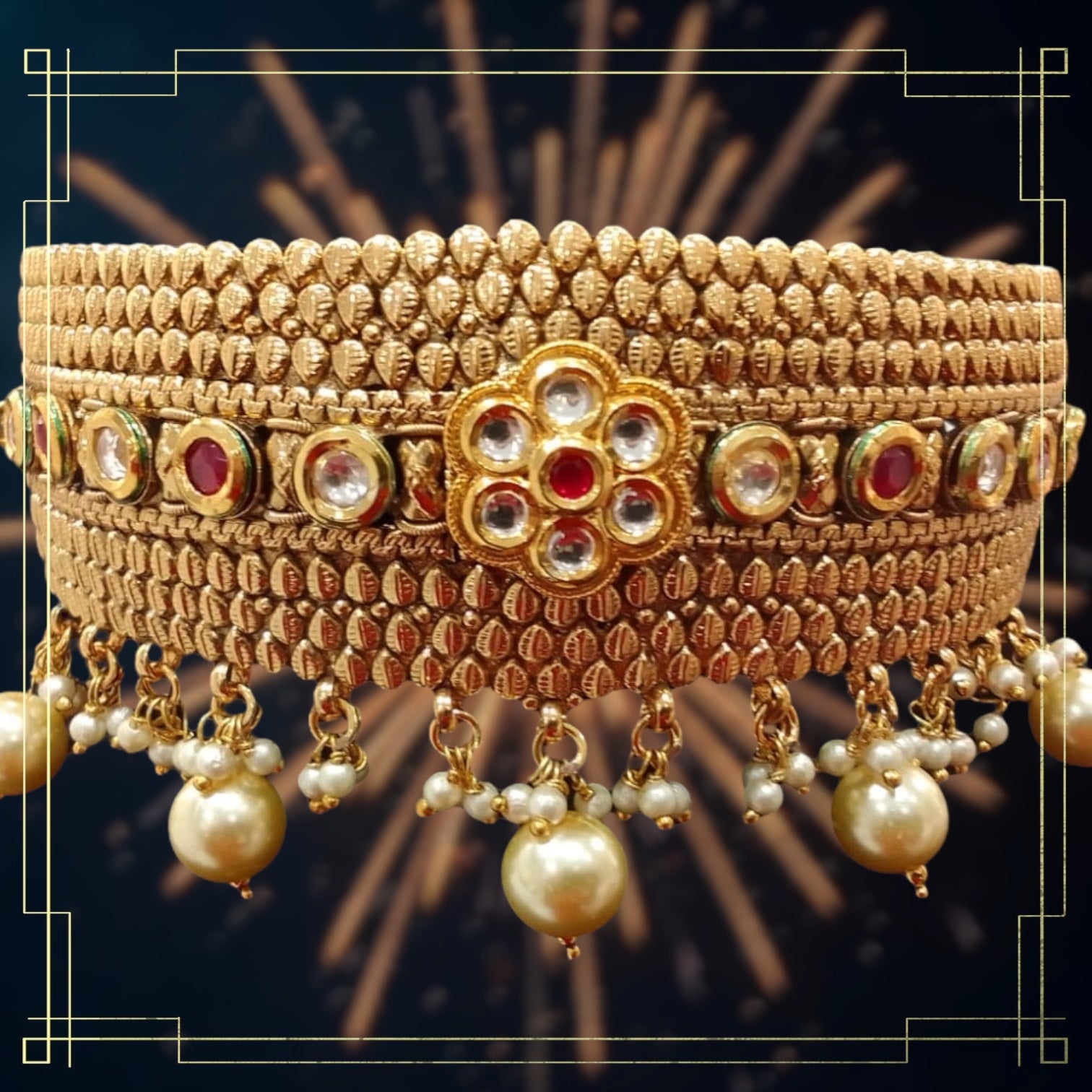 • Choker Design: Features a bold layered structure with leaf-inspired motifs, adorned with vibrant ruby-red and clear stones, along with a central floral medallion. The choker is enhanced with dangling pearl and bead accents for a graceful finish.