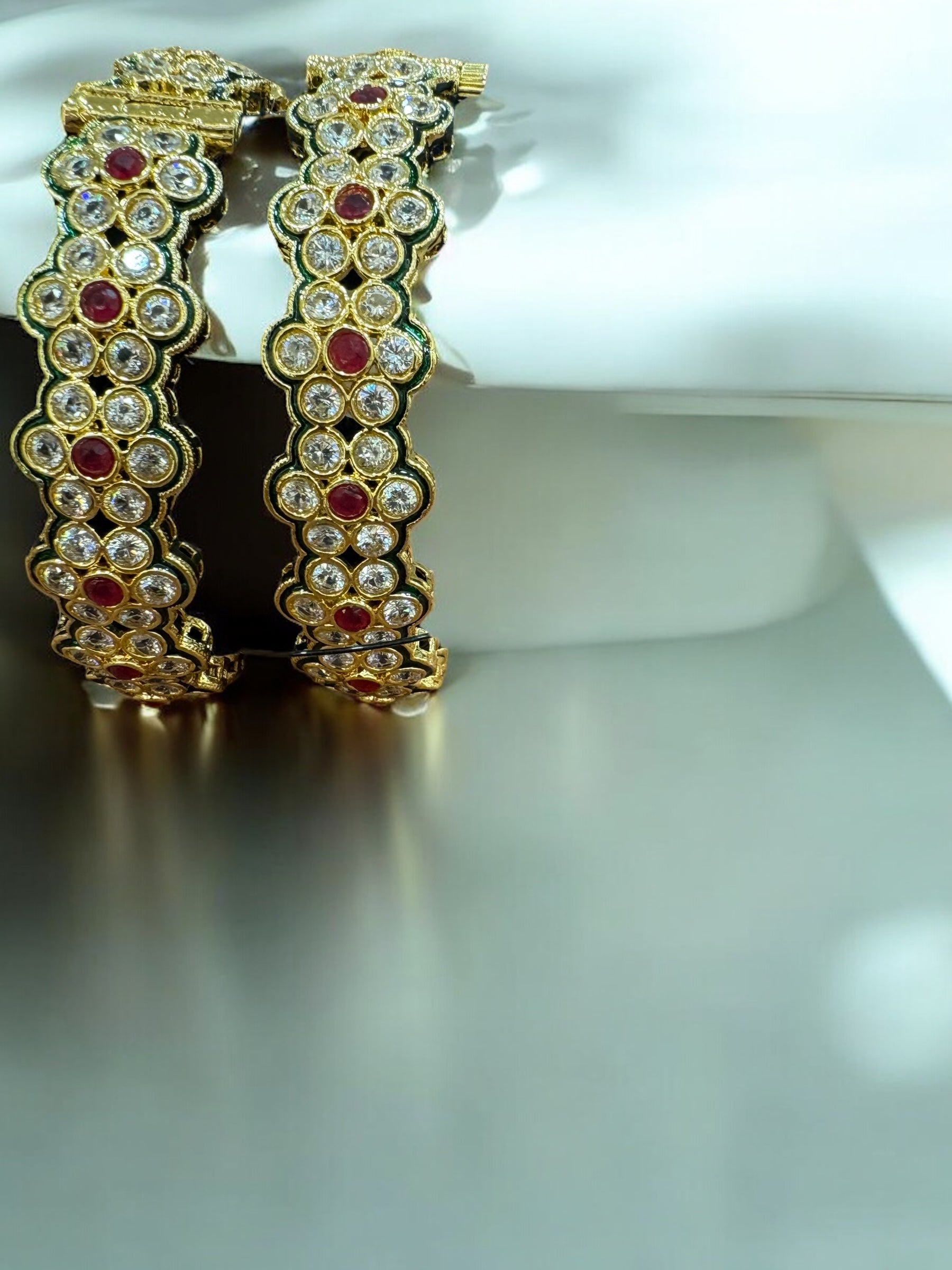 Elevate your jewelry collection with these stunning floral-inspired bangles, meticulously crafted to radiate elegance and sophistication. These bangles feature a seamless blend of vibrant rubies and shimmering diamonds, all set in a rich gold-plated design.