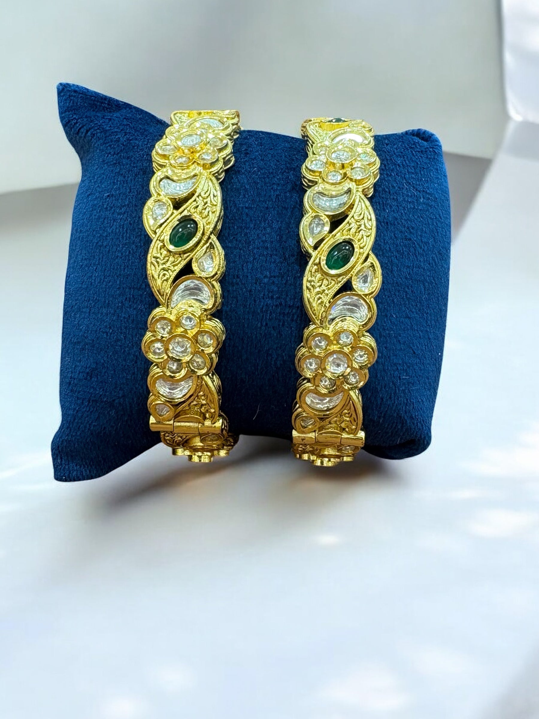 Add a touch of timeless beauty to your jewelry collection with these exquisite gold-toned floral bangles. Designed with a delicate combination of floral motifs and marquise-shaped accents, these bangles feature sparkling white stones along with deep emerald-green embellishments, giving them an elegant and sophisticated appeal.