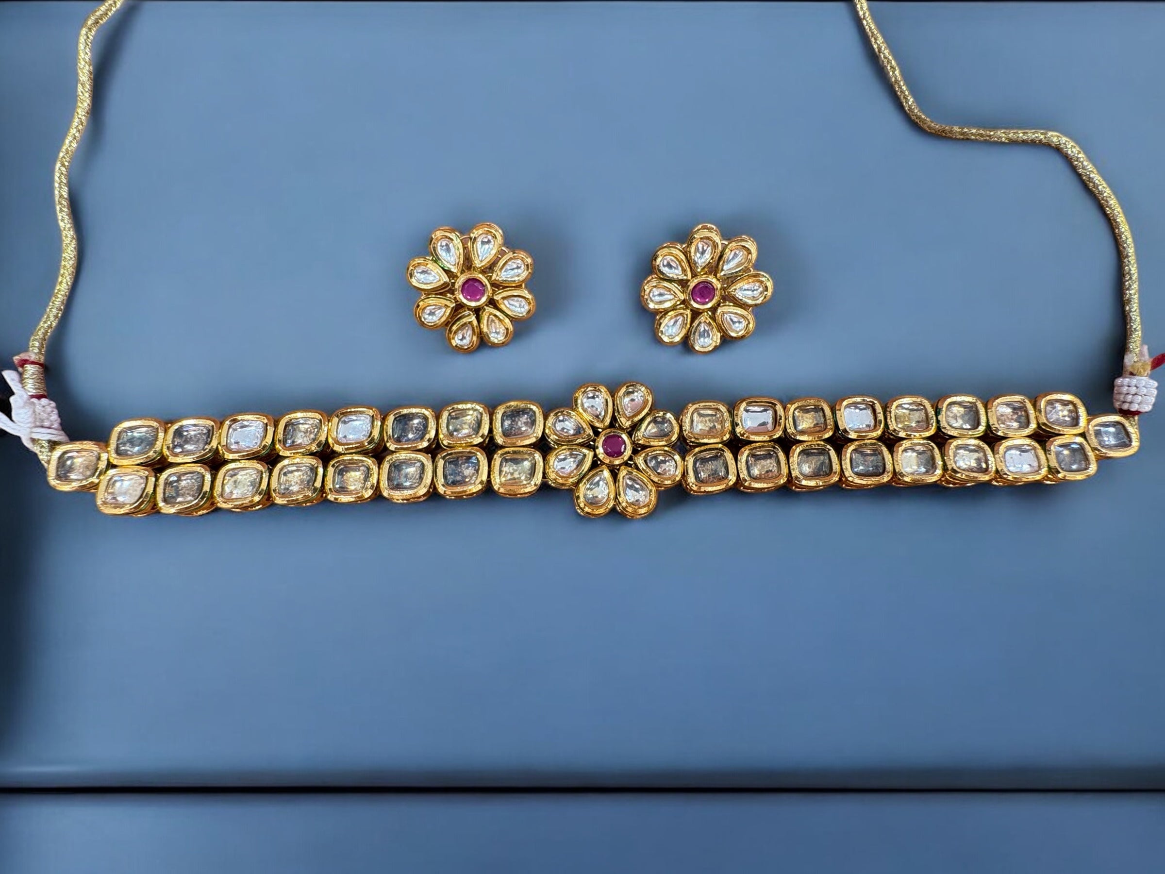 Enhance your jewelry collection with this stunning imitation Kundan choker set, designed to exude elegance and traditional charm. The choker features two rows of square-shaped Kundan stones, creating a regal and sophisticated look. At the center, a floral motif with teardrop-shaped Kundan petals encircles a vibrant ruby-colored stone, adding a pop of color and elegance.