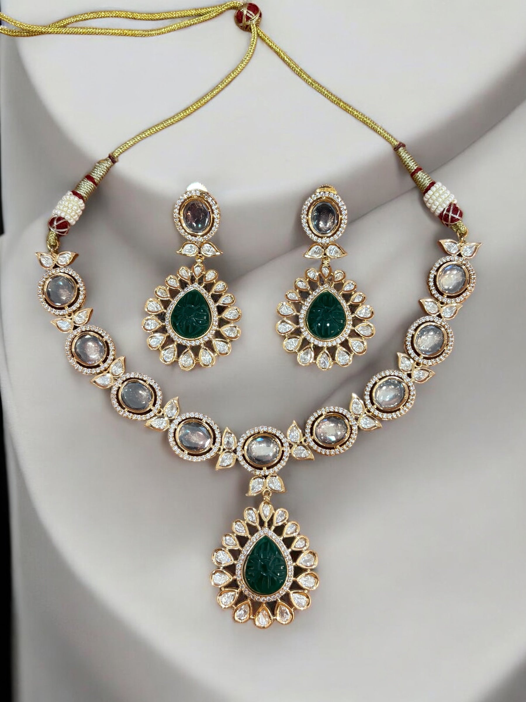 Make a statement with this exquisite Kundan necklace set, a perfect blend of tradition and sophistication. Designed with high-quality uncut Kundan stones, this necklace features a stunning arrangement of oval and teardrop-shaped embellishments, accentuated with sparkling white stones. The carved green stone pendant adds a regal touch, making this set a timeless addition to your jewelry collection.