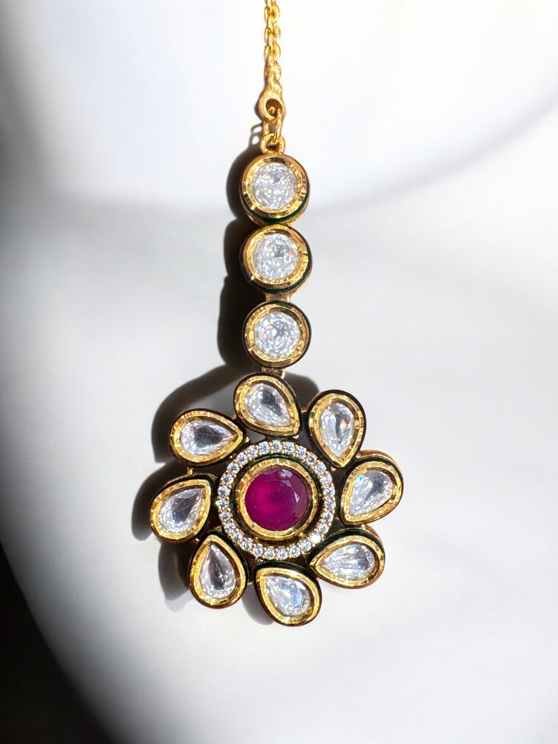 Add a touch of traditional elegance to your ensemble with this stunning Kundan maang tikka. Featuring a floral-inspired design, this piece is adorned with shimmering white Kundan stones, beautifully arranged around a striking ruby-red centerpiece. The gold-plated finish enhances its regal charm, making it a perfect accessory for weddings, festive occasions, and ethnic celebrations.