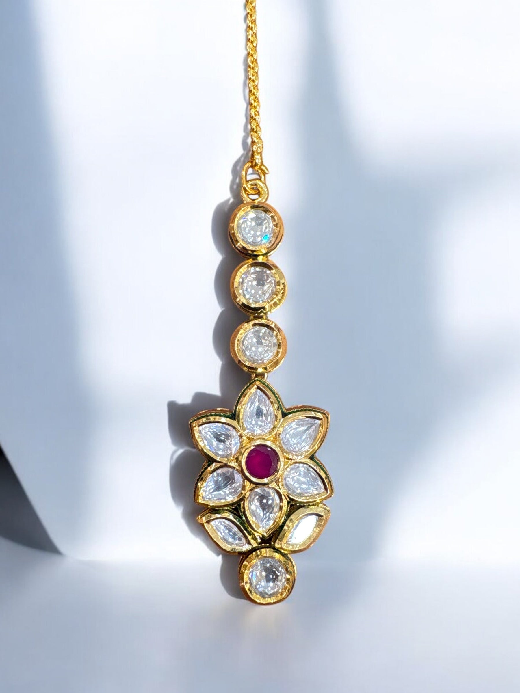 Add a touch of timeless grace to your ethnic ensemble with this exquisite floral-inspired Kundan maang tikka. Featuring a delicate flower design with dazzling Kundan stones, this piece is beautifully accentuated by a striking ruby-colored centerpiece. The intricate craftsmanship and high-quality finish make it a perfect choice for weddings, festive occasions, and traditional celebrations.