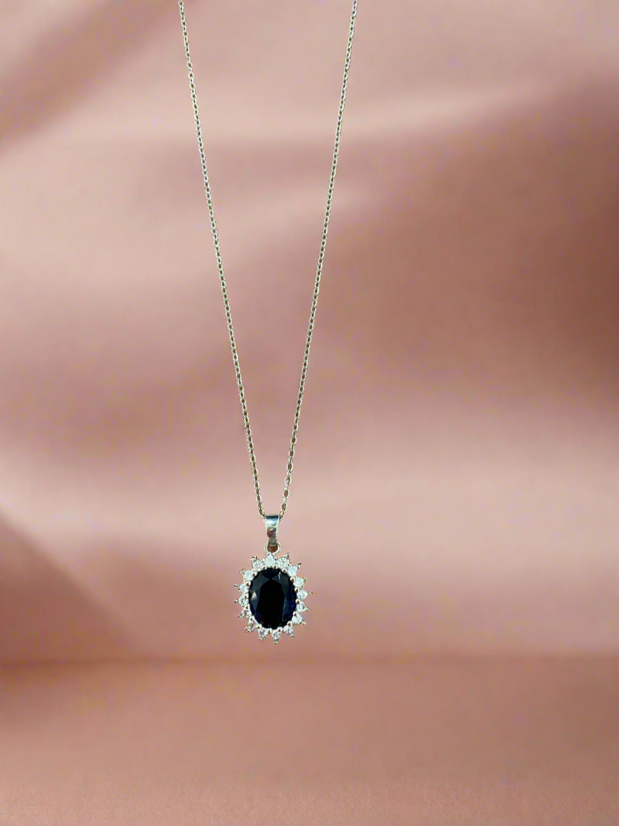 Add a touch of timeless sophistication to your jewelry collection with this stunning sapphire-inspired pendant and earring set. The deep blue, oval-shaped stones are encircled by shimmering crystals, creating a radiant halo effect that exudes luxury and elegance. Set in a high-quality silver-tone finish, this set is designed to sparkle under any light.