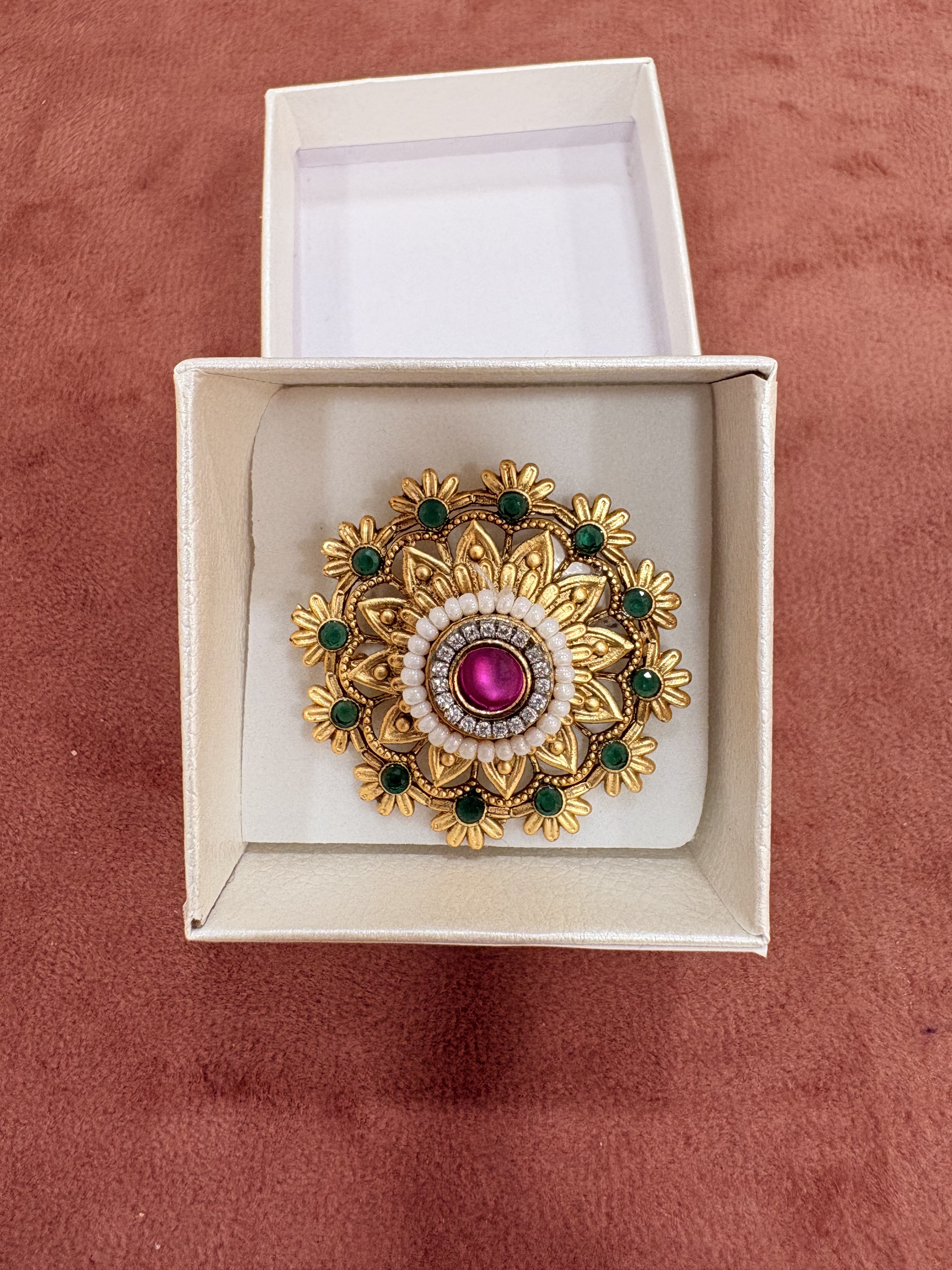 Add a touch of royalty to your ensemble with this magnificent floral-inspired Kundan ring. At its heart lies a captivating pink gemstone, encircled by delicate white beads and shimmering diamond-like embellishments. The outer layer features intricately crafted gold-plated petals adorned with green gemstones, creating a vibrant contrast that exudes opulence.