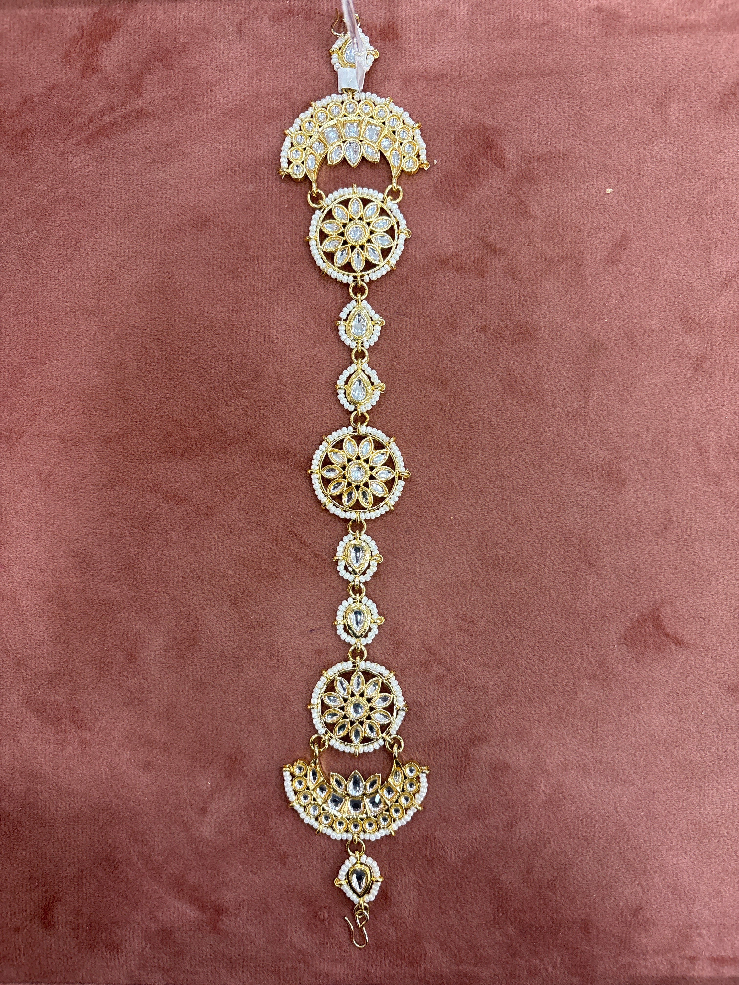 Enhance your look with this exquisite Sheesh Patti, a stunning blend of traditional craftsmanship and modern elegance. Designed to gracefully adorn your forehead, this intricately crafted headpiece features a mesmerizing arrangement of high-quality Kundan stones, delicately set in a gold-toned base.